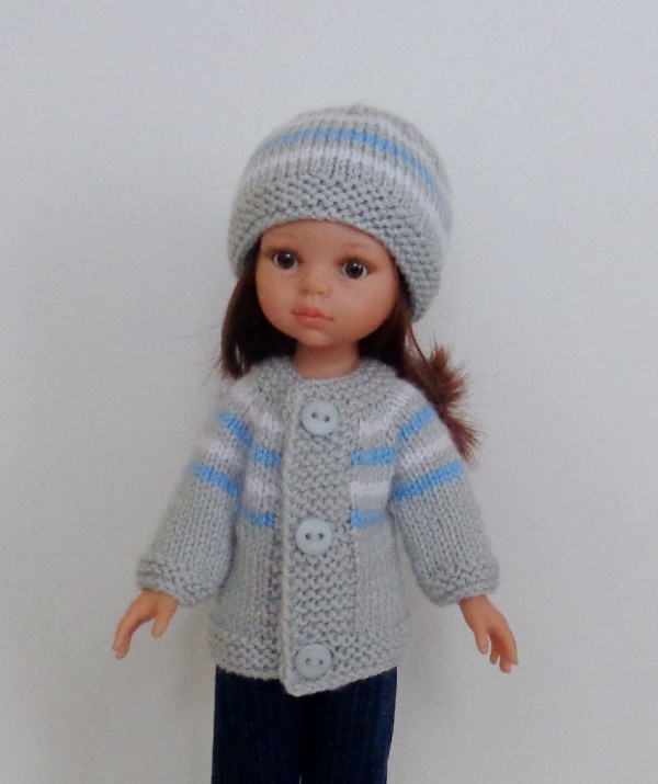 Pletený svetr a čepice na panenku Paola Reina vysokou 32 cm, světle šedá barva s bílými a světle modrými proužky, na přední straně zapínání na knoflíky.