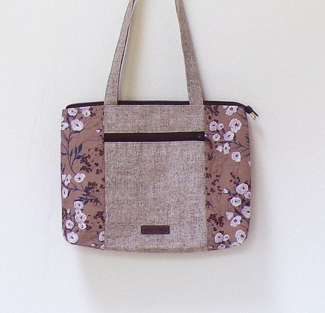 Středně velká dámská kabelka, šitá ze směsových látek pevné struktury, střední díl béžový melír, boční díl hnědý s kvítky. Kabelka je vyztužená, bavlněná podšívka, zapínání na zip. Jedna vnější kapsa na zip, jedna vnitřní kapsa. Dlouhá ucha cca 60 cm pro nošení přes rameno. Kabelka je dostatečně velká i na drobný nákup.