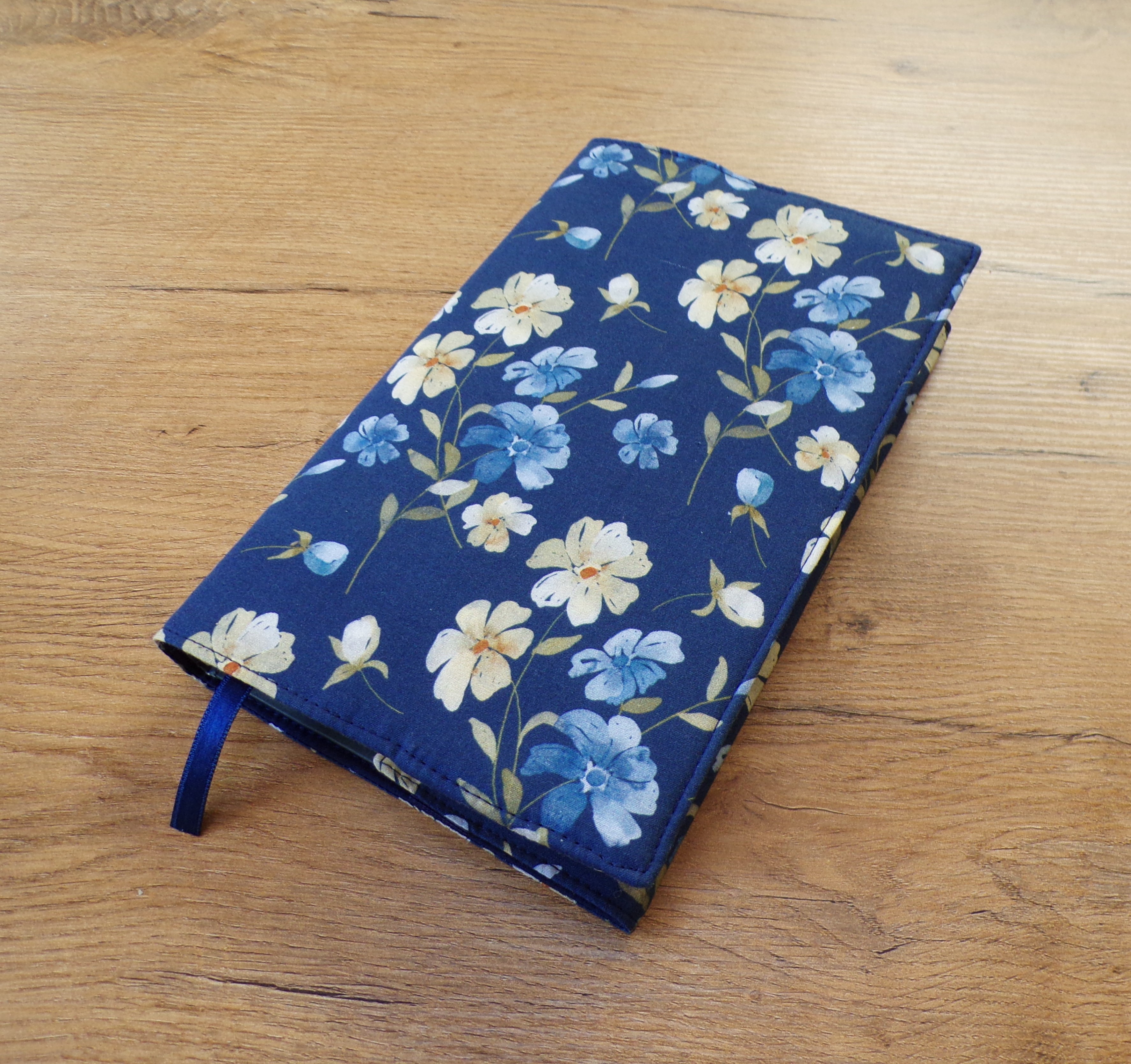 Obal na knihu ušitý z bavlněných látek, na vrchní straně kvítka na tmavě modré, spodní strana je z jednobarevné tmavě modré látky. Obal je vyztužený a po okraji prošitý pro zpevnění a dobře drží tvar, všitá záložka.