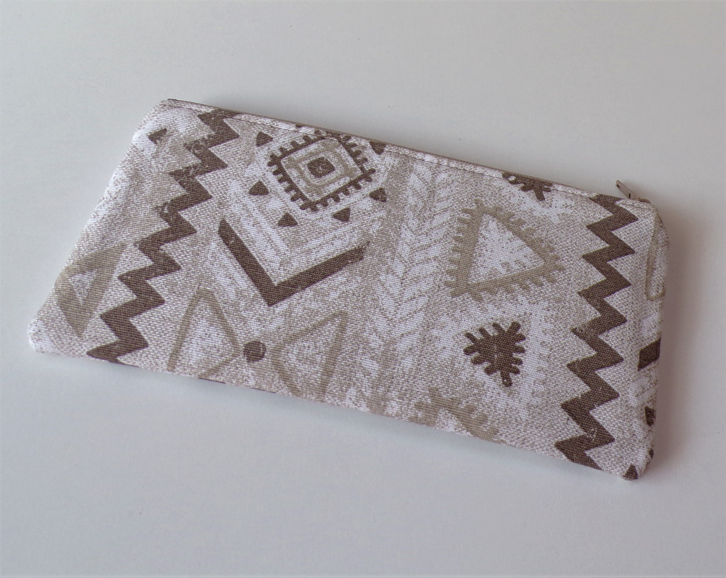 Praktická taštička na drobnosti vhodná do kabelky, lze využít jako pouzdro na mobil. Šitá z pevné bavlněné látky vyšší gramáže, pevně vyztužená, podšívka z bavlněné látky, odšité rohy, zapínání na zip. Velikost 19 x 10 cm.