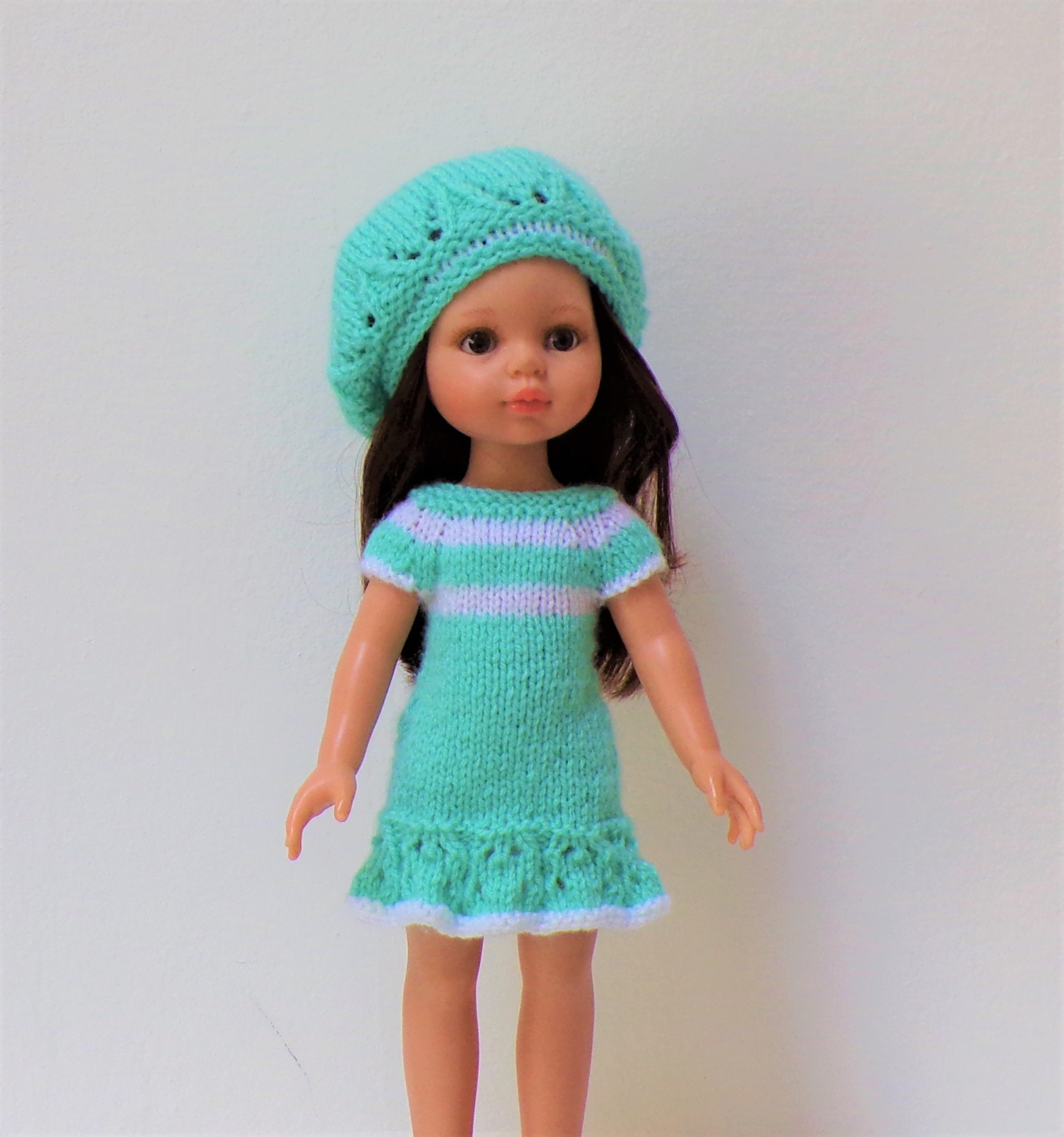 Pletené šaty a baret na panenku Paola Reina vysokou 32 cm, světle zelený tyrkys v kombinaci s bílou barvou, zapínání na zádech na knoflíčky.